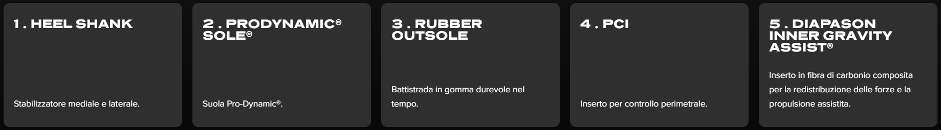 L’inserto Diapason in fibra composita di carbonio induce equlibrio dal contatto al distacco dal suolo senza irrigidire la superficie plantare.