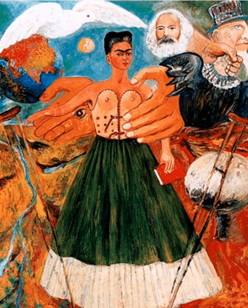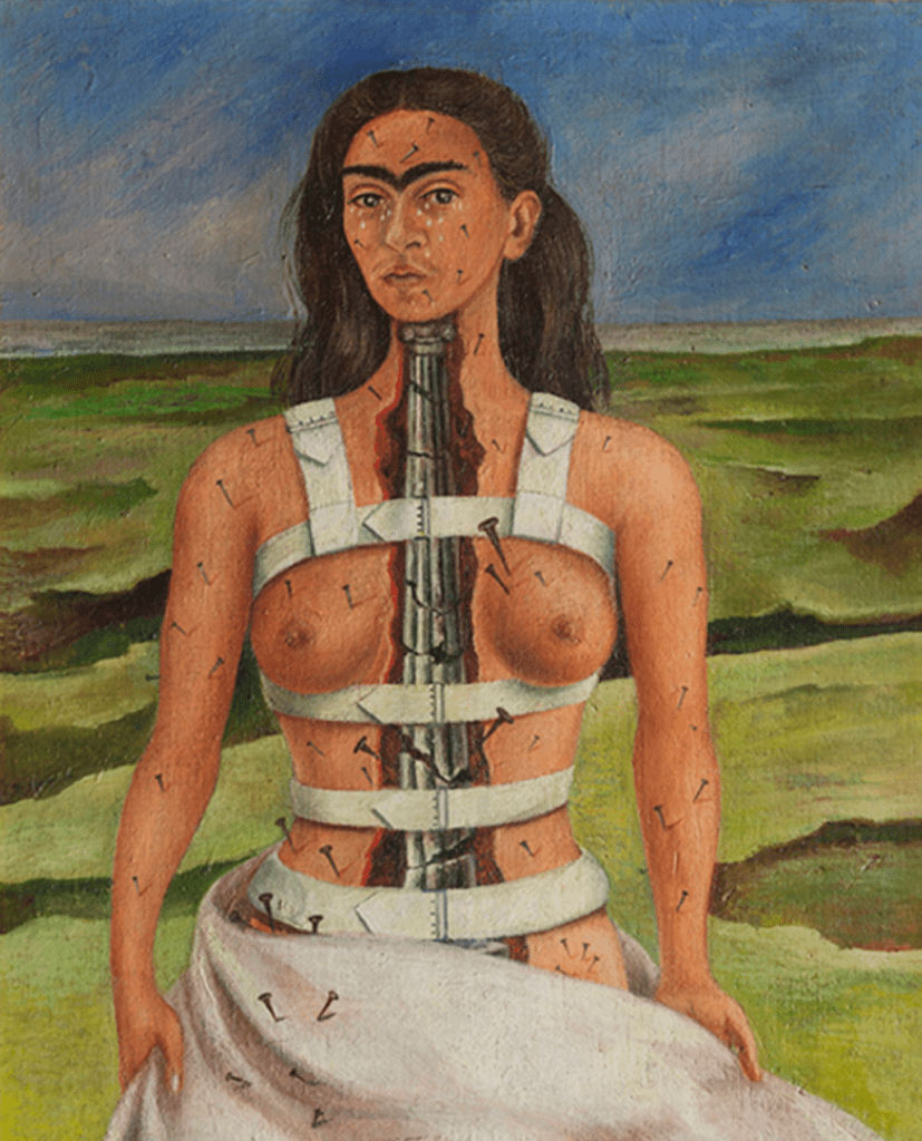 Nella tradizione artistica, i dispositivi ortopedici sono quasi assenti o relegati a contesti scientifici. Kahlo compie qualcosa di straordinario: porta il corsetto al centro della rappresentazione.